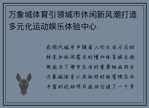 在现代城市中,随着人们生活方式的转变和休闲需求的增加,体育娱乐逐渐成为了都市生活的重要组成部分。万象城体育以其独特的经营理念和丰富的运动项目,成功打造了一个多元化的运动娱乐体验中心,引领了城市休闲的新风潮。本篇文章将从四个方面详细探讨万象城体育如何通过创新的商业模式、丰富的运动项目、科技化的体验和社交互动的空间设计,塑造出一个吸引各类消费者的现代体育娱乐中心,成为城市居民休闲娱乐的新热点。